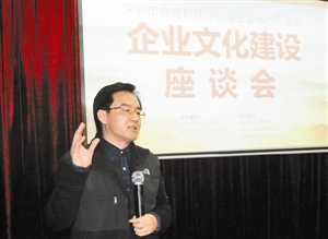 为进一步推进企业培育和践行社会主义核心价值观,促进深圳企业文化建设,2014年12月18日下午,“深圳企业培育和践行社会主义核心价值观暨企业文化建设研讨会”在深圳创意园如期举行。深圳市委宣传部副部长、深圳市企业文化研究会会长李瑞琦,深圳市委宣传部宣传处处长李建阳等专家学者,以及南航、万科等企业相关负责人和工商联负责人30余人共聚一堂、畅所欲言,共话共商企业文化建设之路。