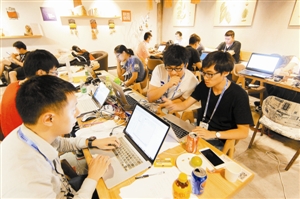 在3W咖啡屋内,参加全球创客马拉松的创客们正在认真工作。
