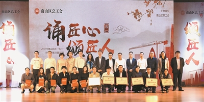 昨日下午,南山区总工会在南山会堂举办庆“五一”“诵匠心·颂匠人”评选表彰主题活动,2017年深圳市劳动模范、先进集体代表,“五一”劳动奖章、“五一”劳动奖状获奖个人及获奖单位代表应邀出席;2017年南山区先进职工之家代表和优秀工会工作者,以及各街道工会主席、各街道总工会副主席、区总工会直管工会主席、区职业化工会工作者、社区工联会主席、部分企业工会干部、职工代表近700人参加活动。