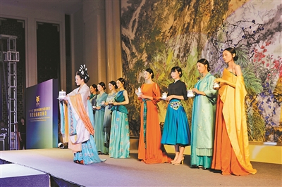 昨天的发布会上,模特手捧斯达高“集贤瓷”走秀。