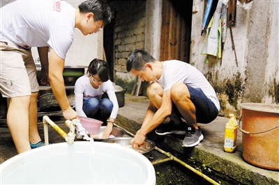 当天参加活动的人员分为4组,带着爱心款和物资到留守儿童家庭进行探访。高温酷暑,太阳毒辣,参加活动的大人孩子徒步几公里来到各自关爱对象的家庭时,个个汗水打湿衣衫。周永国带着几名行员探访杨秀梅与杨志安姐弟家。12岁的姐姐和9岁的弟弟都读三年级,爸爸在惠州务工,71岁的爷爷拖着患有20多年甲状腺瘤的身体照顾着姐弟。举目望去,家里唯一像样的是一台21英寸彩电,但满满的奖状在粗糙的水泥墙上很是耀眼——这就是家庭的希望。尽管老人有些木讷,孩子们也不乏羞涩,但对深圳客人,祖孙三人拿出了十二万分的热情。姐弟俩带着深圳的小伙伴到菜园里摘了红辣椒和青菜,爷爷示范做客家酿豆腐……在大家的通力合作下,一顿像模像样的午餐做好了,欢声笑语荡漾在这个农家小院。