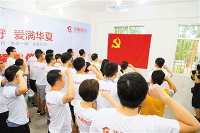 在简陋的食堂临时布置的背景板下,36个孩子身着他们最好的衣服,有些拘谨地从华夏银行深圳分行的叔叔阿姨手中接过送给他们的礼物,脸上露出青涩与开心的笑容……8月4日~5日,在广东省龙川县紫市镇永新小学,华夏银行深圳分行与深圳市一加二青少年成长关爱中心合作的“情系留守、爱满华夏”活动助力精准扶贫,用爱心行动托起了当地留守儿童梦想的希望;华夏银行深圳分行“两学一做”实践活动也同时倾情开展,所有党员共同面对党旗再次庄严宣誓,展现了共产党员的先锋形象。