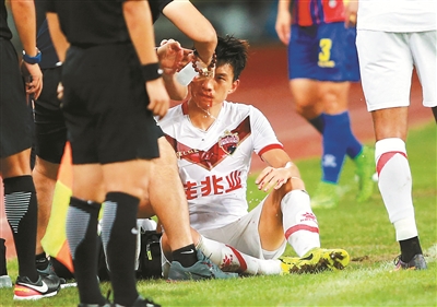 深圳佳兆业队员乔巍在比赛中受伤后继续坚持出场。