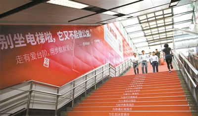 “走有爱台阶,用步数献爱心”,“为留守儿童捐步”,“为助学教育捐步”……近日,一条特别的红色通道出现在深圳购物公园地铁站出入口,红色的台阶和墙面上,号召人们用一种新鲜的方式做公益:爬楼梯。