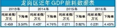 第一届低碳城论坛是2013年举办的,当时龙岗的地方生产总值是2143亿元,2016年已经达到3177亿元,年均增长14%。与此同时,龙岗的万元GDP能耗从2013年的0.458吨标准煤下降到2016年的0.231吨标准煤,年均下降25.6%,远远高于GDP增长的速度,这充分说明龙岗借助低碳城品牌在绿色低碳经济方面已经取得一定的成效。