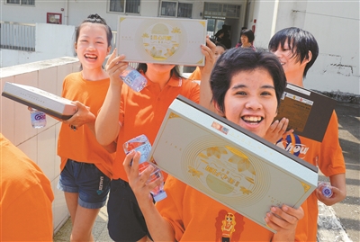 捐赠的“中秋献爱心 鹏城送温暖”公益活动在深圳市救助站举行。图为孩子们兴高采烈地领月饼。
