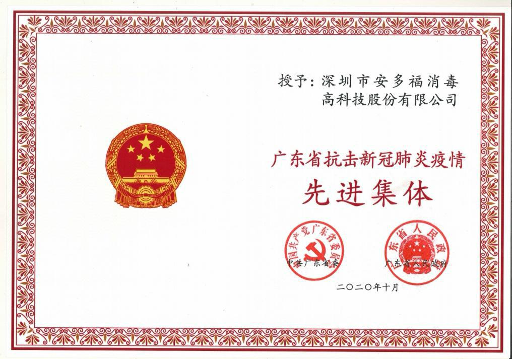 在抗击新冠肺炎疫情和复工复产过程中,安多福始终坚持把疫情防控作为最重要的工作之一。疫情期间,公司全员上班,为医疗机构紧急配送消毒防护用品。在疫情最严重的时候,在深圳市政府领导的关怀和支持下,在各界积极抗疫同仁的配合下,保障了原料输入及成品输出,将一批批抗疫物资及时送到亟需的单位,同时也保障了疫情期间人们的消毒防疫需求,为抗击新冠肺炎疫情做出了积极的贡献。在广东省抗击新冠肺炎疫情表彰大会上,深圳市安多福消毒高科技股份有限公司获评“广东省抗击新冠肺炎疫情先进集体”荣誉称号。